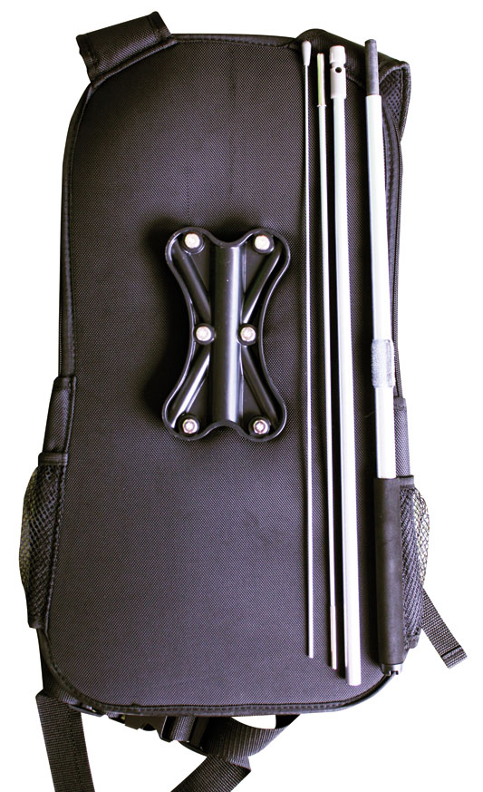 Der Rucksack besteht aus beschichtetem Nylon und dient als Tragegestell für die Fahne. Das Fahnenbefestigungssystem ist leicht, aber gleichzeitig auch robust. Zusätzlich verfügt der Rucksack über verstärkte Gurte, sodass ein stabiler und sicherer Halt gewährleistet wird. Der Gürtel ist verstellbar, so kann der Rucksack individuell angepasst werden. Die komfortable Polsterung sorgt für einen angenehmen und guten Sitz. Die Gestänge lassen sich in einer praktischen Zusatztasche auf der Tragegurtseite aufbewahren.