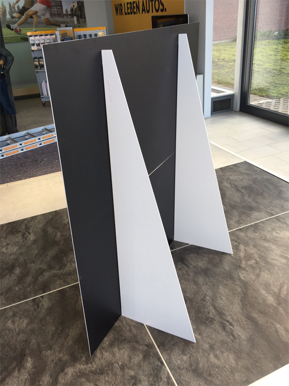 Sowohl Höhe als auch Breite der Platten kann ab einem Mindestformat von 10 cm x 10 cm frei gewählt werden. Dabei kann entweder auf Format oder auf Kontur geschnitten werden, so sind auch andere Formen als viereckig möglich. Das verwendete Material ist weißer Hartschaum mit einer Dicke von 3 mm. Auf Wunsch können die Platten mit 4 mm dicken Bohrungen in den Ecken erworben werden, welche eine einfache Anbringung ermöglichen.
